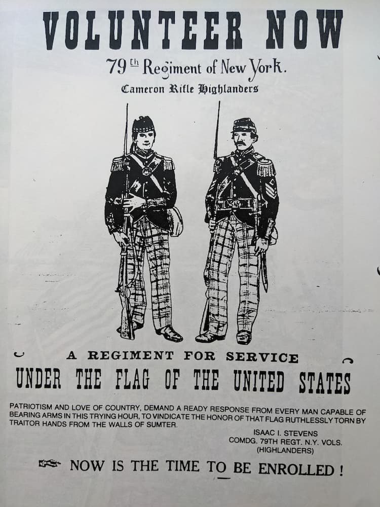 After the Confederate attack on Fort Sumpter in April 1861, that precipitated the Civil War, the US War Department authorised the formation of the 79th New York Volunteers regiment which was “mustered into the service of the United States for three years May 29, 1861”. Many of the men recruited to the volunteer regiment would have previously been in the 79th militia.